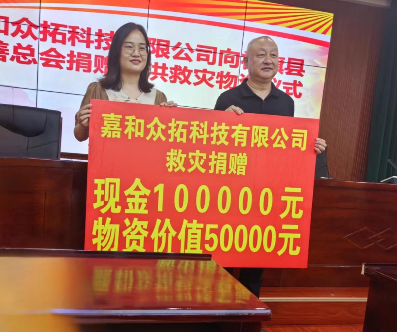 2024年7月19日,洪水无情人有情,在社旗县抗洪救灾关键时刻, 嘉和众拓科技以实际行动践行社会责任和担当,向社旗县慈善总会捐赠十万元现金、五万元物资。捐赠现场,一辆辆满载爱心物资的货车正在卸载,一件...